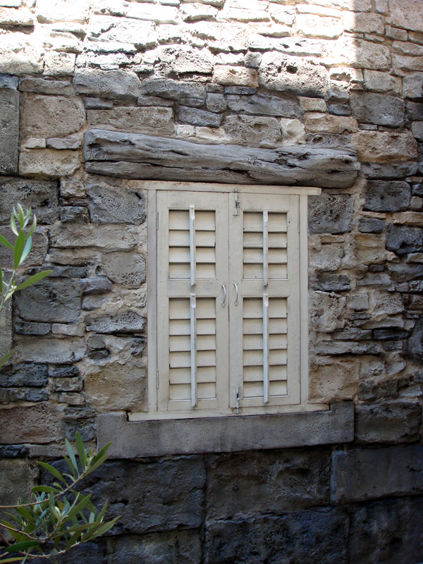 2枚目の画像にある、窓上に埋め込まれた丸太は石積みの中のちょっとした遊びです。